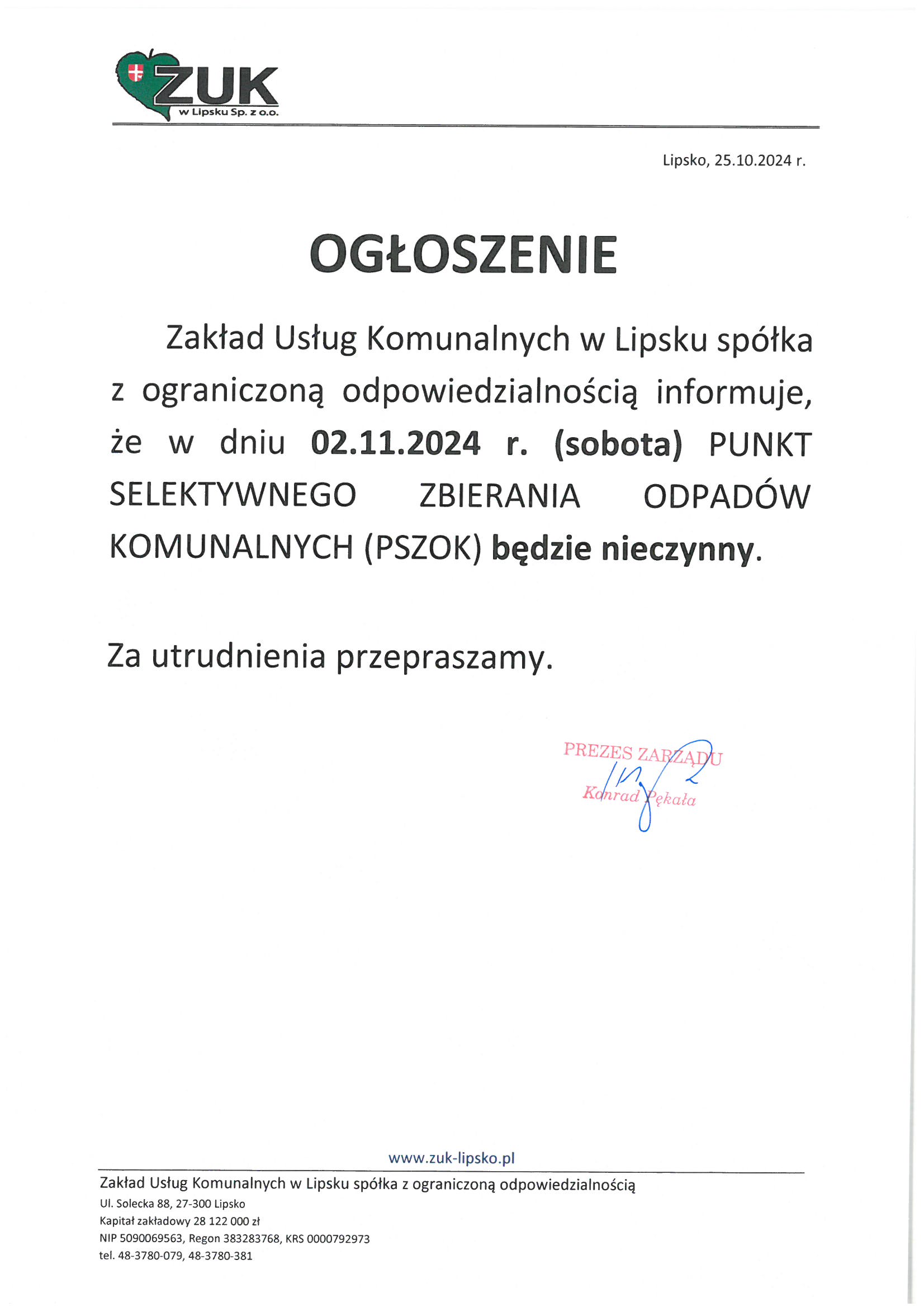 W dniu 02.11.2024 r. (sobota) PSZOK będzie nieczynny