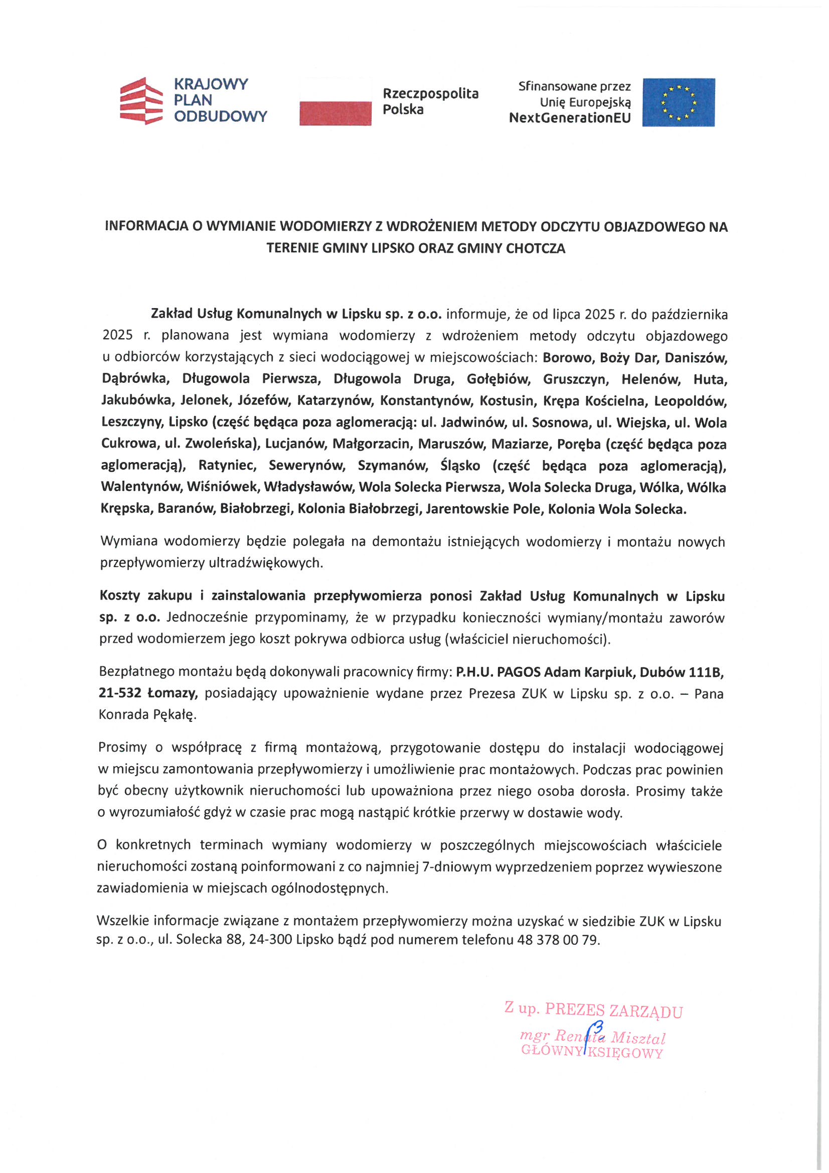 Informacja o wymianie wodomierzy z wdrożeniem metody odczytu objazdowego na terenie gminy Lipsko oraz gminy Chotcza