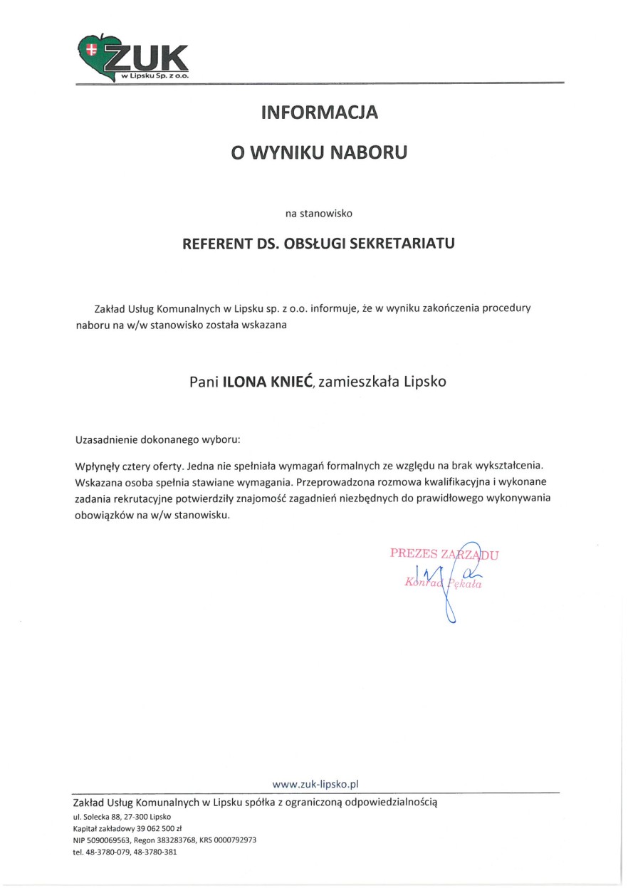 Zakład Usług Komunalnych w Lipsku Sp. z o.o. informuje, że w wyniku zakończenia procedury naboru na stanowisko Referenta ds. Obsługi Sekretariatu, do zatrudnienia została wybrana: