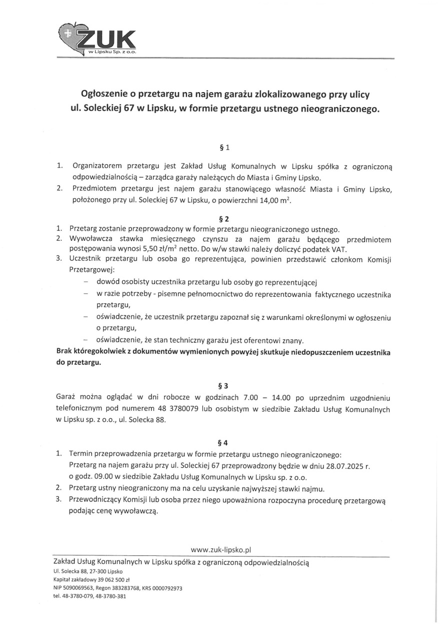 Ogłoszenie o przetargu na najem garażu zlokalizowanego przy ulicy  ul. Soleckiej 67 w Lipsku, w formie przetargu ustnego nieograniczonego.