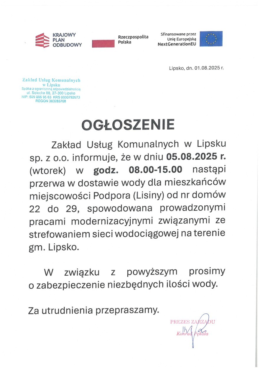 Zakład Usług Komunalnych w Lipsku sp. z o.o. informuje, że w dniu 05.08.2025 r. (wtorek) w godz. 08.00-15.00 nastąpi przerwa w dostawie wody dla mieszkańców miejscowości Podpora (Lisiny) od nr domów 22 do 29, spowodowana prowadzonymi pracami modernizacyjnymi związanymi ze strefowaniem sieci wodociągowej na terenie gm. Lipsko.