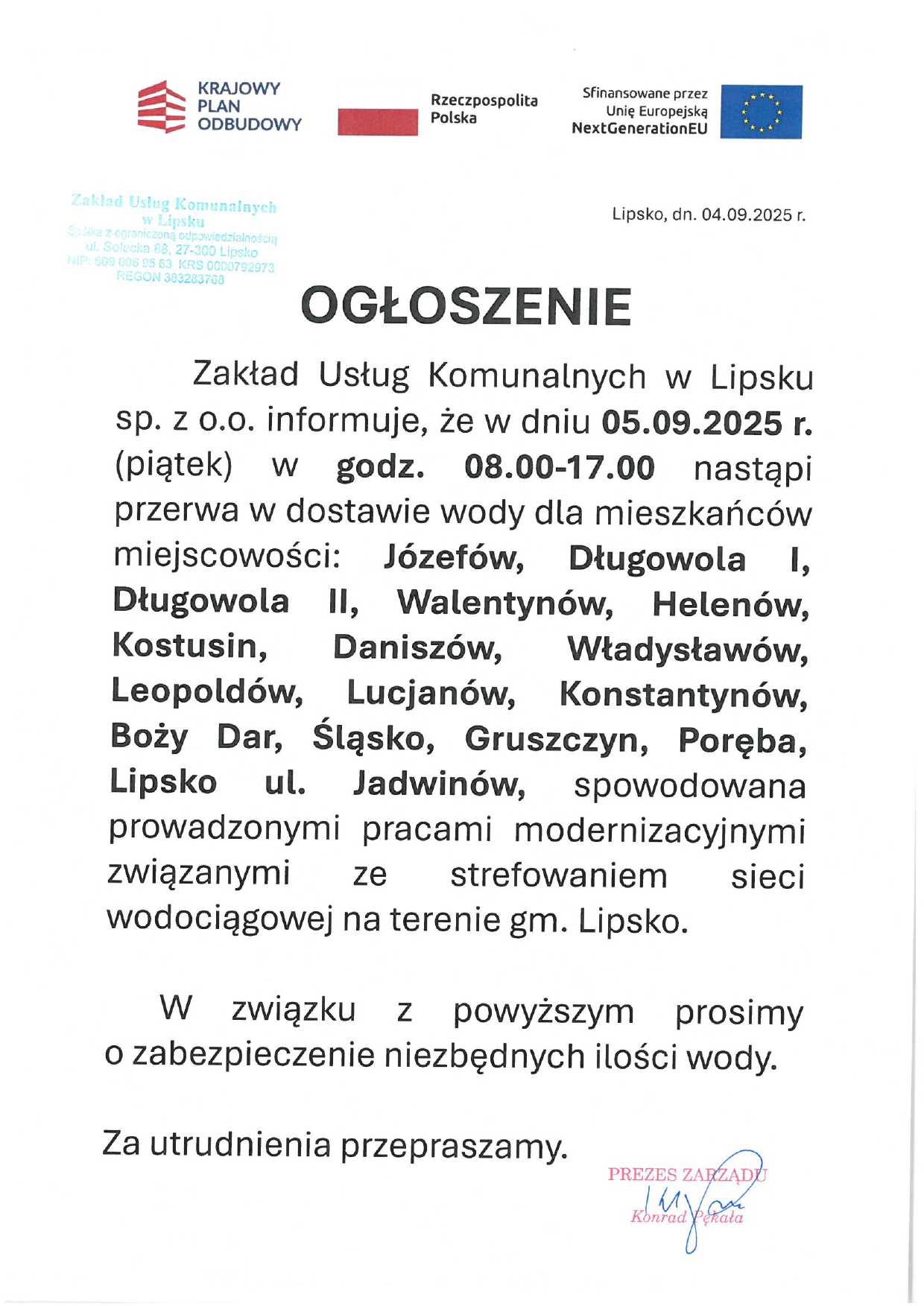 Zakład Usług Komunalnych w Lipsku sp. z o.o. informuje, że w dniu 05.09.2025 r. (piątek) w godz. 08.00-17.00 nastąpi przerwa w dostawie wody dla mieszkańców miejscowości: Józefów, Długowola I, Długowola II, Walentynów, Helenów, Kostusin, Daniszów, Władysławów, Leopoldów, Lucjanów, Konstantynów, Boży Dar, Śląsko, Gruszczyn, Poręba, Lipsko ul. Jadwinów, spowodowana prowadzonymi pracami modernizacyjnymi związanymi ze strefowaniem sieci wodociągowej na terenie gminy Lipsko.