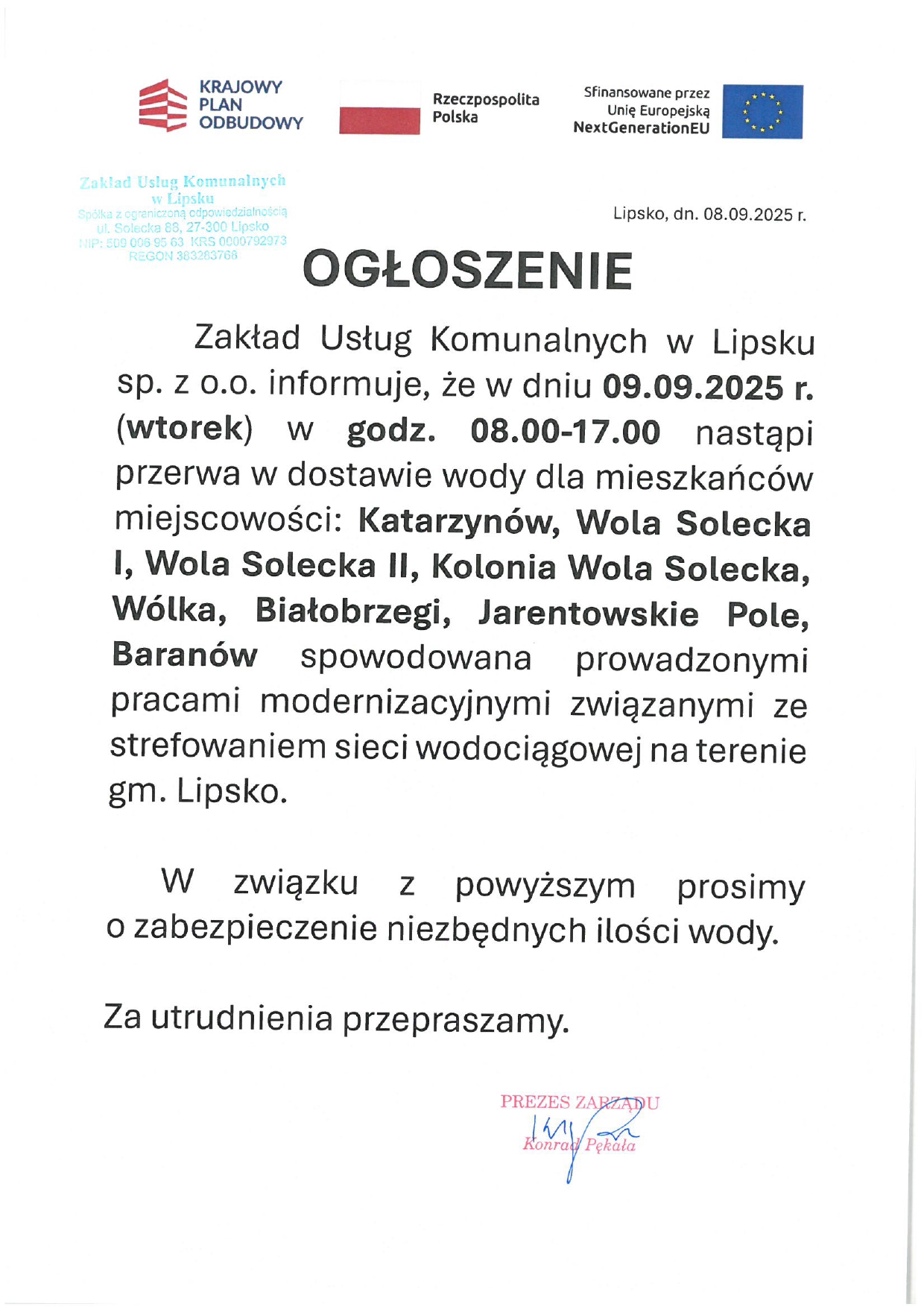 Zakład Usług Komunalnych w Lipsku sp. z o.o. informuje, że w dniu 09.09.2025 r. (wtorek) w godz. 08.00-17.00 nastąpi przerwa w dostawie wody dla mieszkańców miejscowości: Katarzynów, Wola Solecka I, Wola Solecka II, Kolonia Wola Solecka, Wólka, Białobrzegi, Jarentowskie Pole, Baranów spowodowana prowadzonymi pracami modernizacyjnymi związanymi ze strefowaniem sieci wodociągowej na terenie gm. Lipsko.