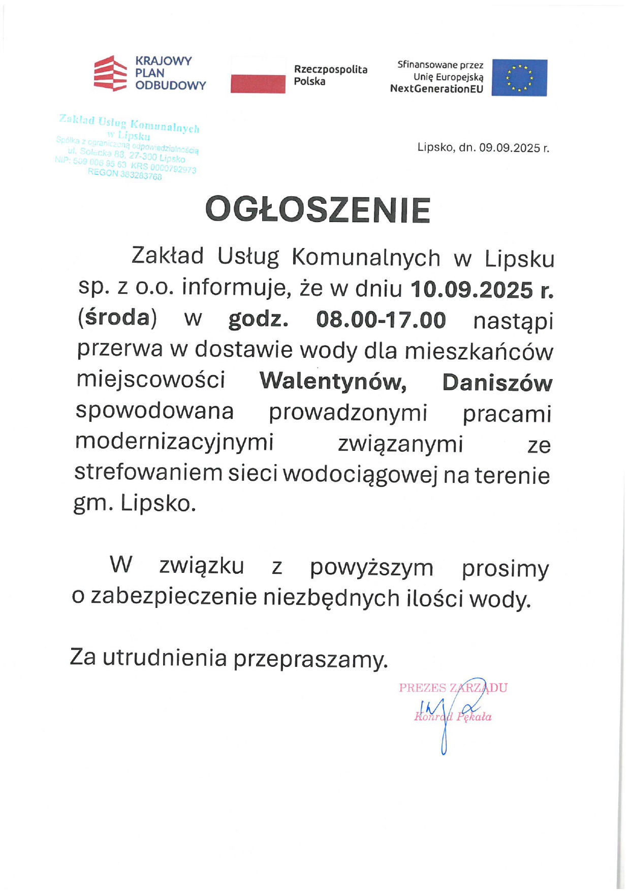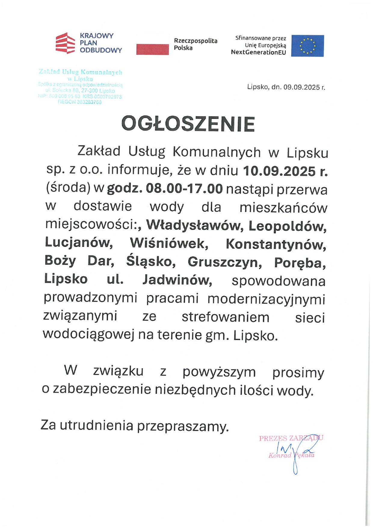 Zakład Usług Komunalnych w Lipsku sp. z o.o. informuje, że w dniu 10.09.2025 r (środa) w godz. 08.00-17.00 nastąpi przerwa w dostawie wody dla mieszkańców miejscowości Walentynów, Daniszów, Władysławów, Leopoldów, Lucjanów, Wiśniówek, Konstantynów, Boży Dar, Śląsko, Gruszczyn, Poręba, Lipsko ul. Jadwinów, spowodowana prowadzonymi pracami modernizacyjnymi związanymi ze strefowaniem sieci wodociągowej na terenie gm. Lipsko.