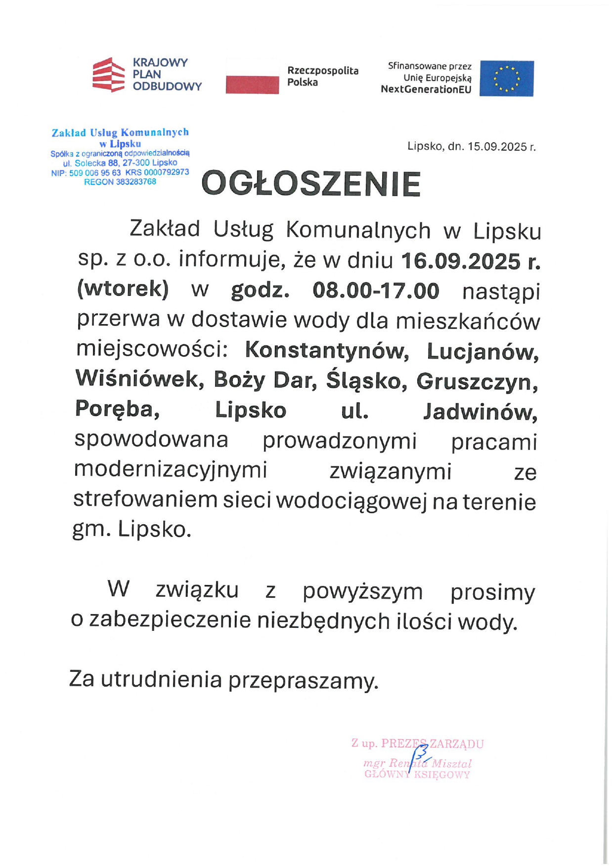 Zakład Usług Komunalnych w Lipsku sp. z o.o. informuje, że w dniu 16.09.2025 r. (wtorek) w godz. 08.00-17.00 nastąpi przerwa w dostawie wody dla mieszkańców miejscowości: Konstantynów, Lucjanów, Wiśniówek, Boży Dar, Śląsko, Gruszczyn, Poręba, Lipsko ul. Jadwinów, spowodowana prowadzonymi pracami modernizacyjnymi związanymi ze strefowaniem sieci wodociągowej na terenie gm. Lipsko.