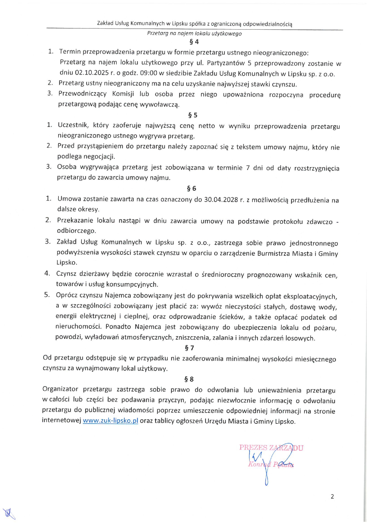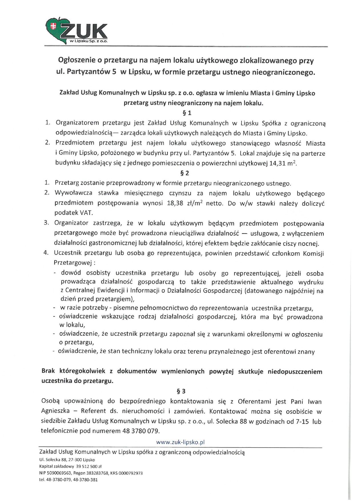 Ogłoszenie o przetargu na najem lokalu użytkowego zlokalizowanego przy ul. Partyzantów 5 w Lipsku, w formie przetargu ustnego nieograniczonego