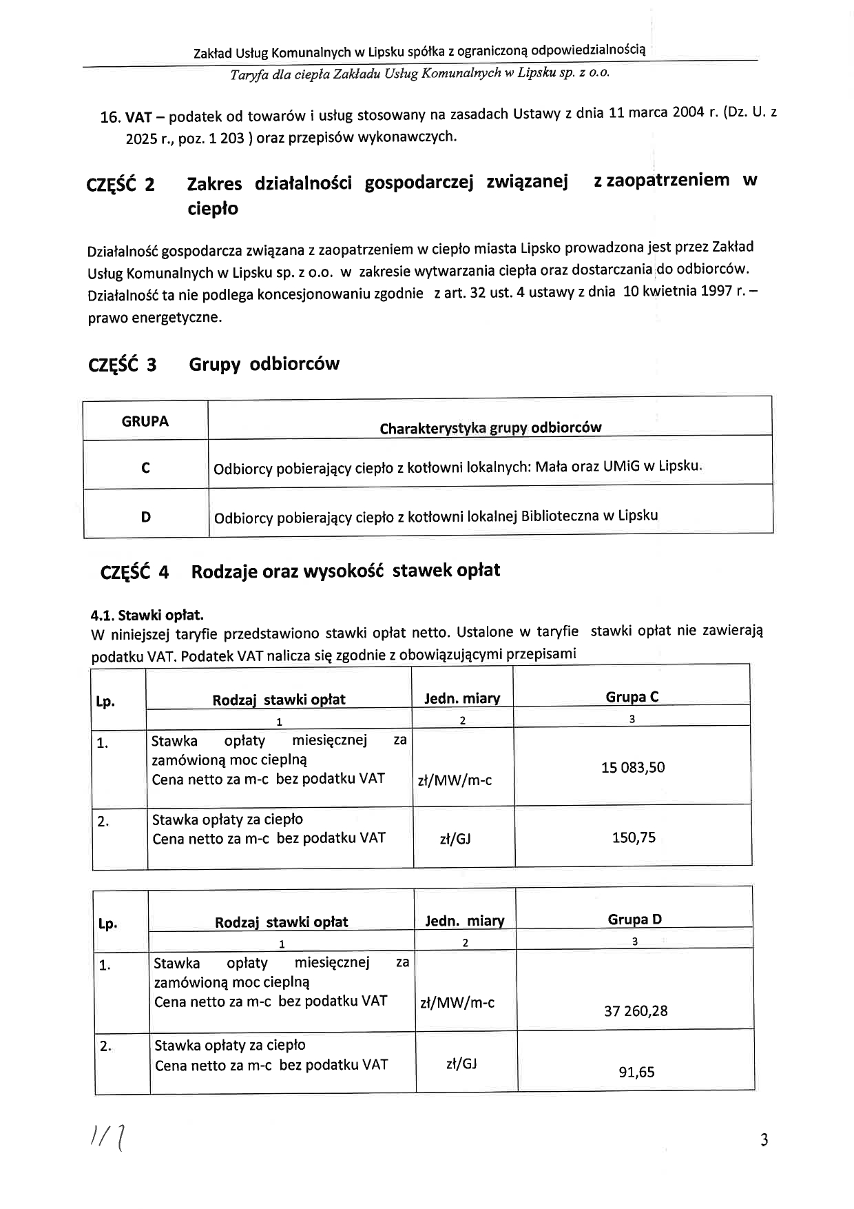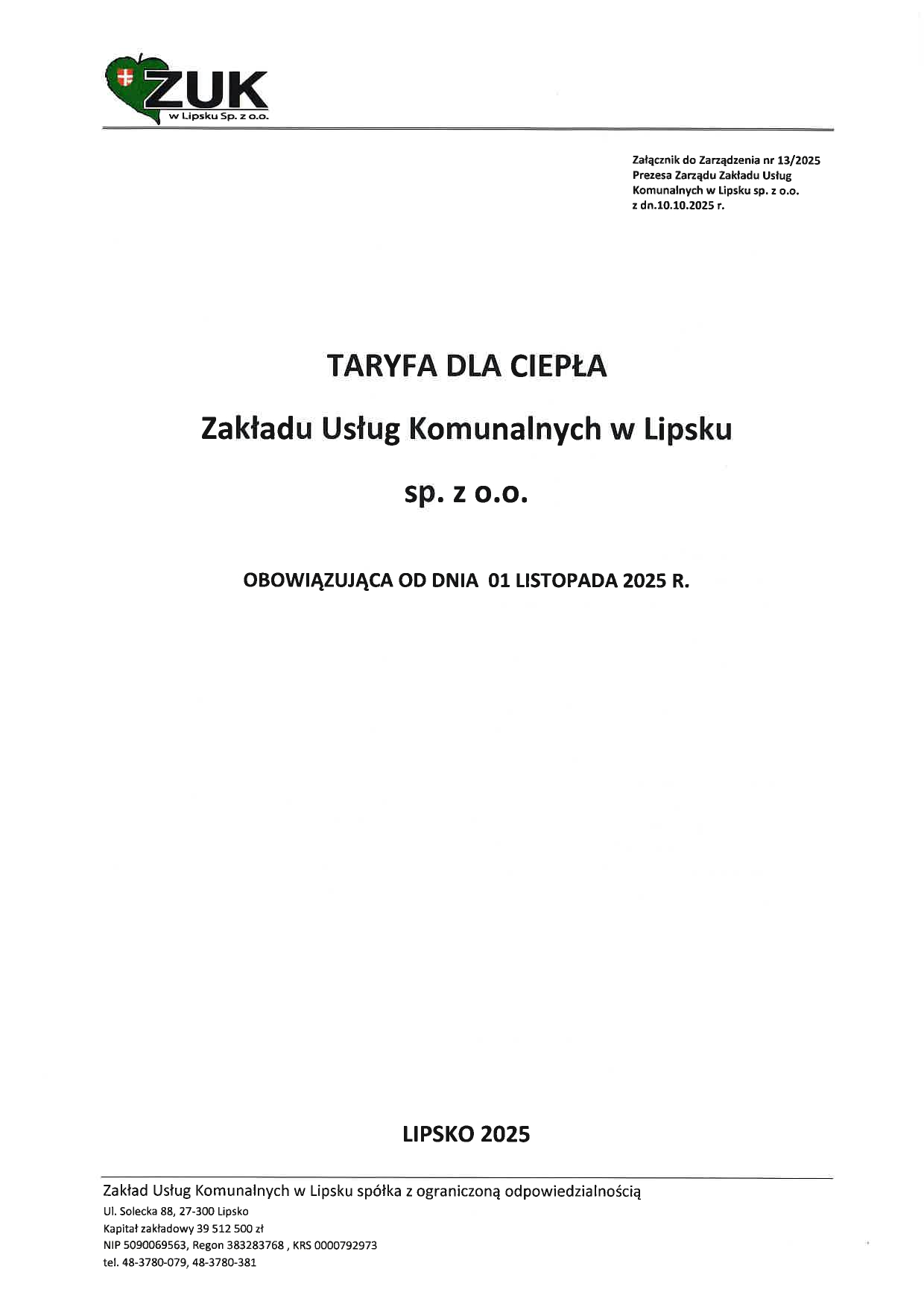 Zarządzeniem nr 13/2025 Prezesa Zakładu Usług Komunalnych w Lipsku z dnia 10 października 2025 r. zatwierdzono Taryfę dla ciepła.