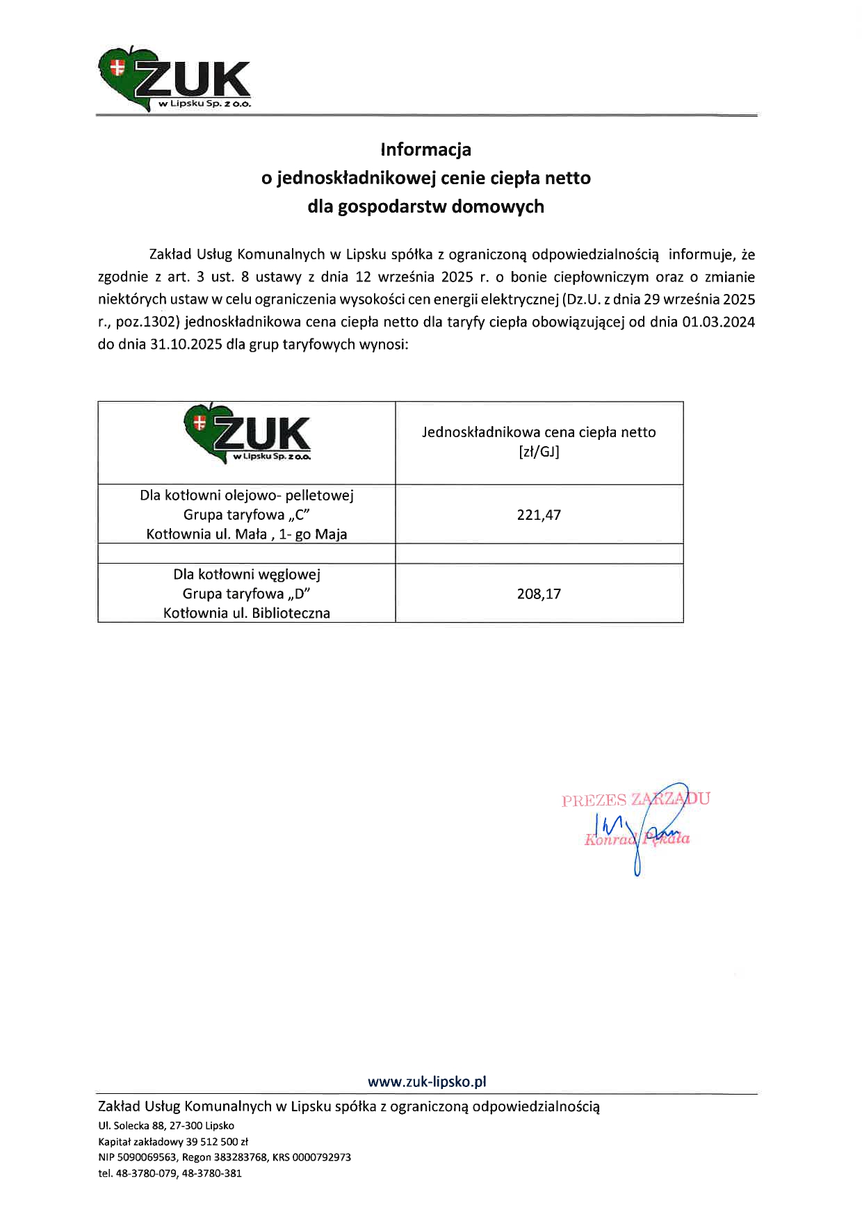 Informacja o jednoskładnikowej cenie ciepła netto dla gospodarstw domowych