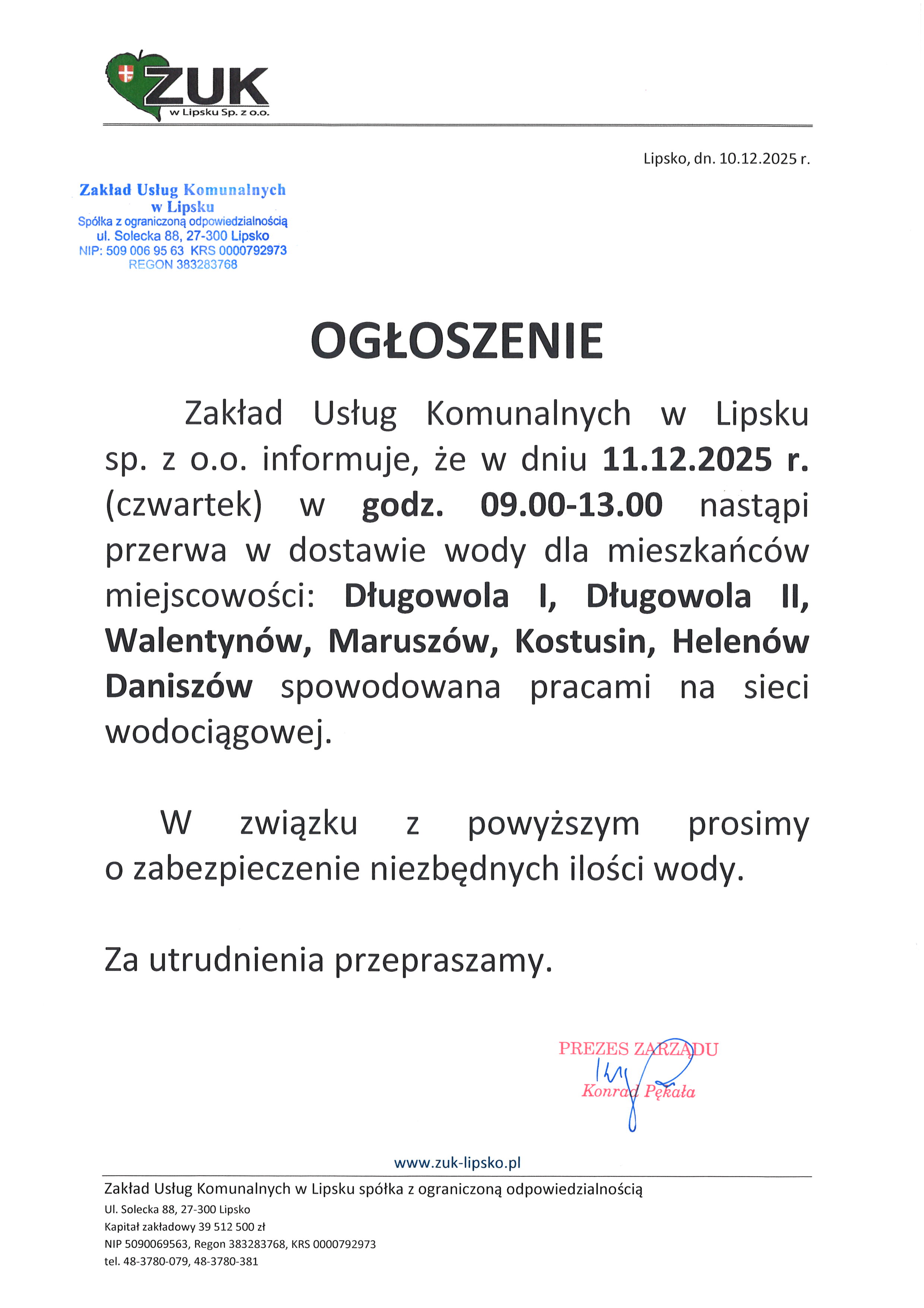 Zakład Usług Komunalnych w Lipsku sp. z o.o. informuje, że w dniu 11.12.2025 r. (czwartek) w godz. 09.00-13.00 nastąpi przerwa w dostawie wody dla mieszkańców miejscowości: Długowola I, Długowola II, Walentynów, Maruszów, Kostusin, Helenów, Daniszów spowodowana pracami na sieci wodociągowej.
