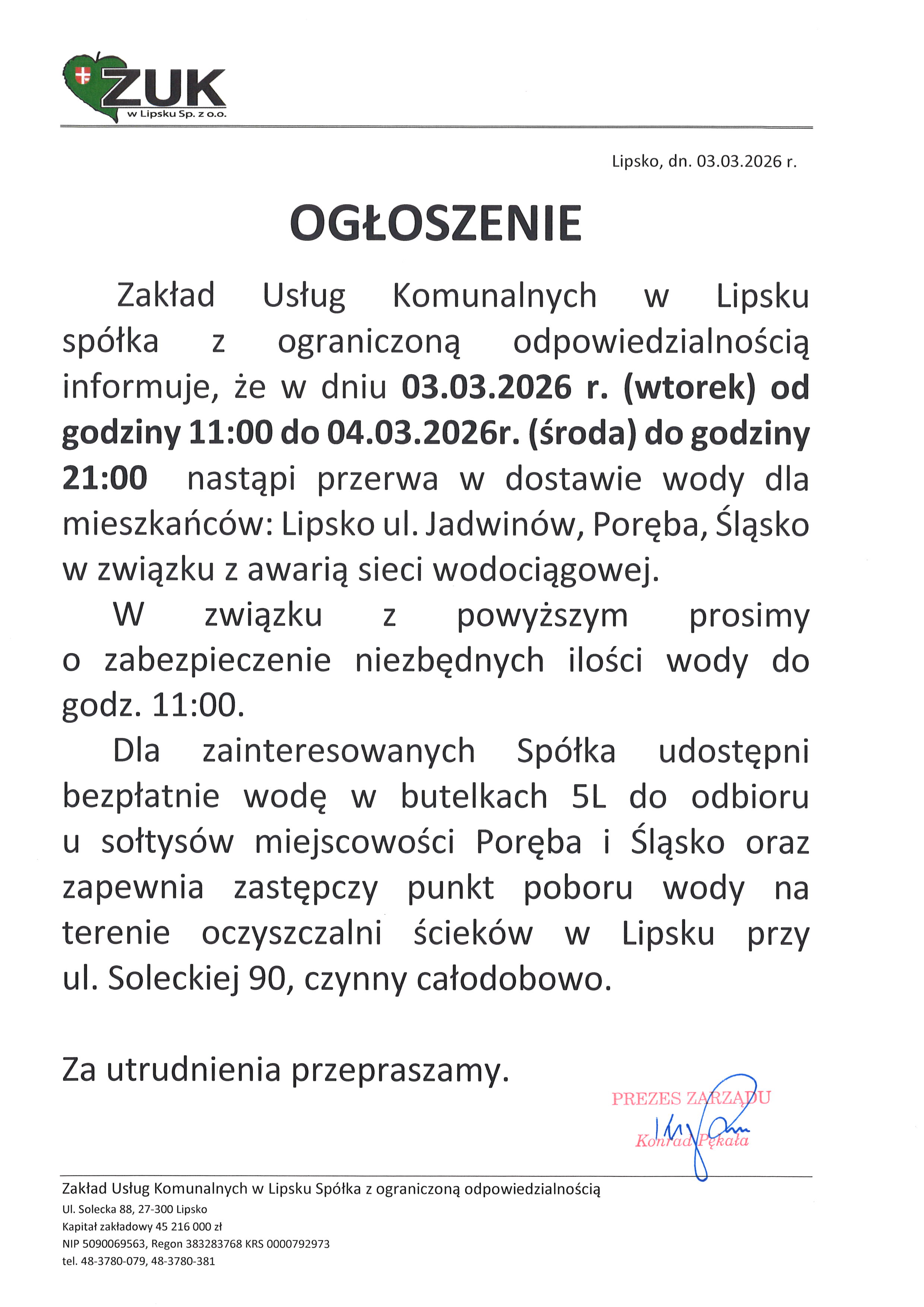 Zakład Usług Komunalnych w Lipsku sp. z o.o. informuje, że w dniu 03.03.2026 r. (wtorek) od godziny 11:00 do 04.03.2026 r. (środa) do godz.21:00 nastąpi przerwa w dostawie wody dla mieszkańców: Lipsko ul. Jadwinów, Poręba, Śląsko w związku z awarią sieci wodociągowej.