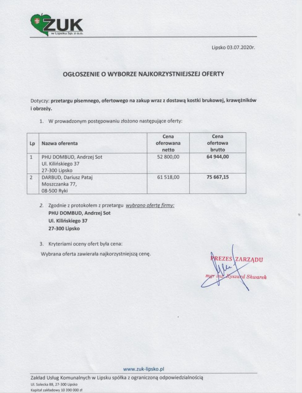 Ogłoszenie o wyborze najkorzystniejszej oferty na zakup wraz z dostawą kostki brukowej, krawężników i obrzeży