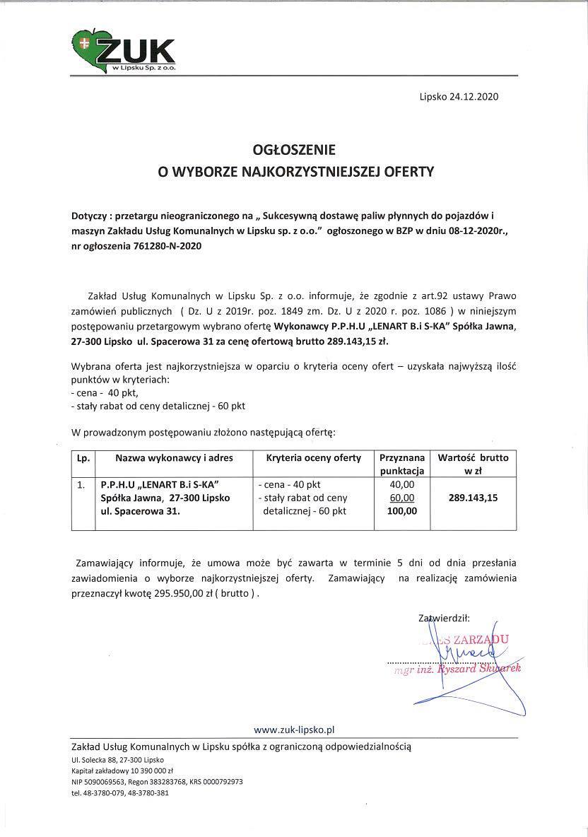 Dla zamówienia publicznego o szacunkowej wartości powyżej 30 000 EURO prowadzonego w trybie przetargu nieograniczonego na : „Sukcesywną dostawę paliw płynnych do pojazdów i maszyn Zakładu Usług Komunalnych w Lipsku Sp. z o.o."