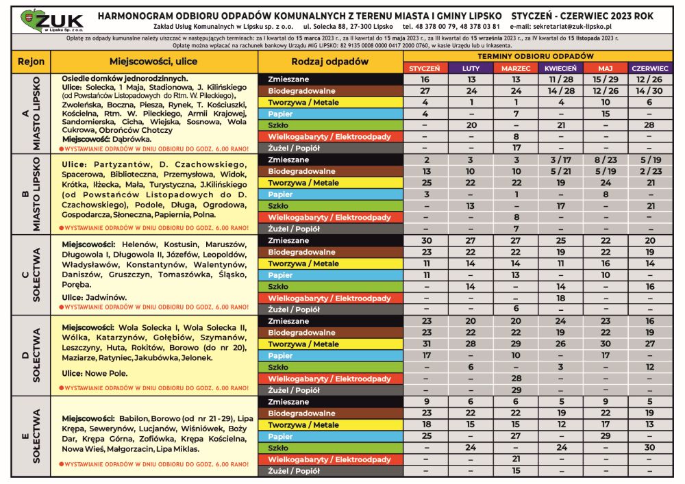 Harmonogram odbioru odpadów komunalnych oraz zasady segregacji Styczeń-Czerwiec 2023 r.